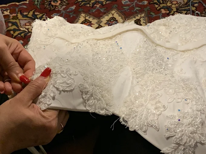 Shiraz Alteration in Houston, TX, perfects gowns with detailed beading and embellishments, ensuring secure, dazzling finishes that elevate elegance and provide lasting durability for your special wedding day.